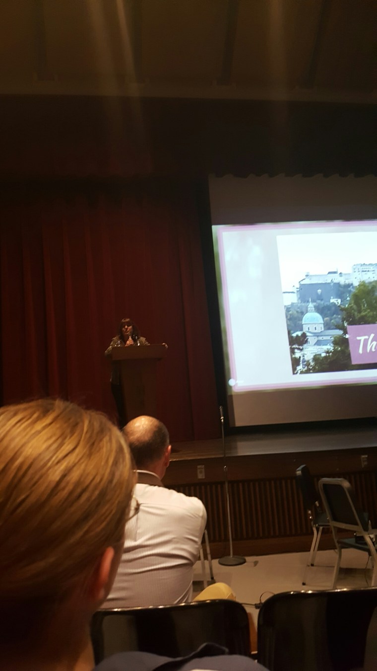 Debbie Turner speaks to a large crowd about her role in the Sound of Music