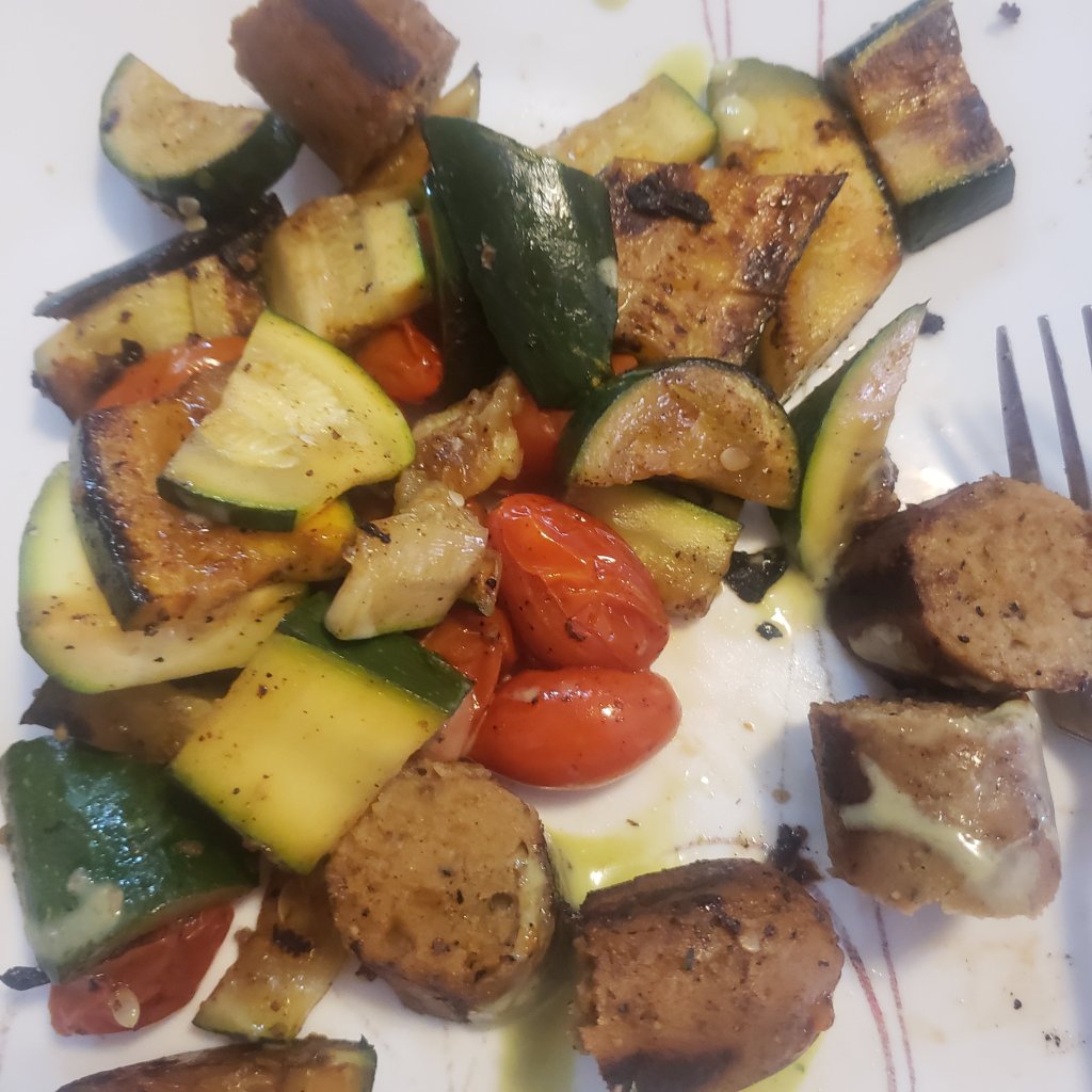 My steamer is always producing a good hot meal whenever I need something filling and hot like this Field Roast vegetarian sausage, zucchini, and cherry tomatoes dish with Herdez Avocado hot sauce.